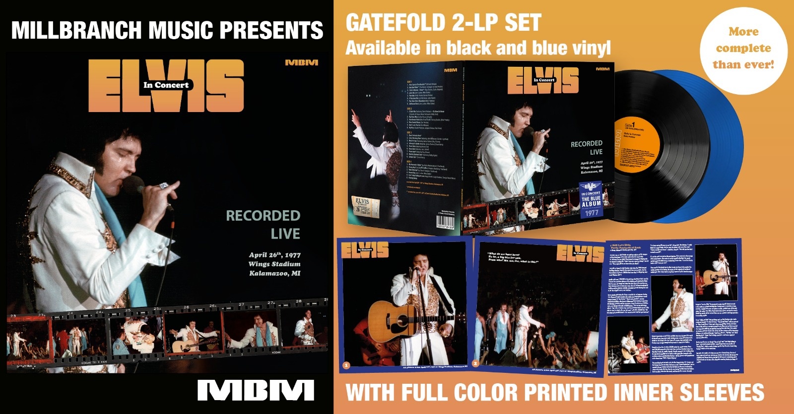 Elvis In Concert – Kalamazoo 1977 is a 2-LP set with printed innersleeves containing intensive liner notes,