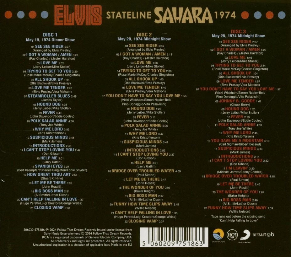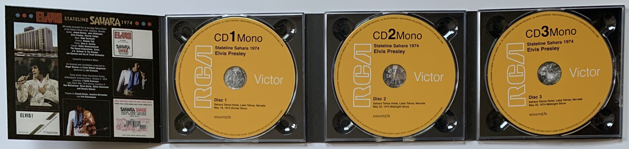 The FTD label released this release in April 2024: Elvis Stateline Sahara 1974 Lake Tahoe Nevada. A 3 CD set in the 5" format featuring three great shows that Elvis performed in Lake Tahoe in 1974 on May 19 (evening show), May 20 (midnight show), and May 25 (midnight show).