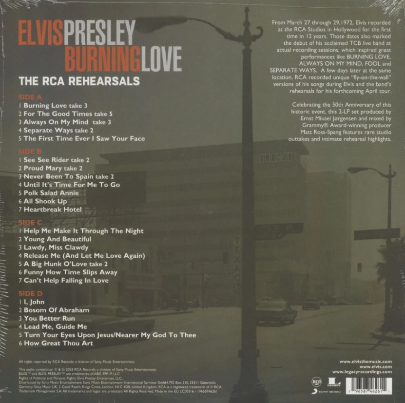Burning Love: The RCA Rehearsals bundelt het beste van de repetitie-opnames rond Elvis' Amerikaanse tournee in april 1972, allemaal afkomstig uit de nieuwe Elvis On Tour-collectie. De 2LP-set bevat zeldzame en niet eerder uitgebrachte versies van "Burning Love", "Heartbreak Hotel" en "Jailhouse Rock", samen met enkele van Elvis' favoriete covers, gospelsongs en meer.