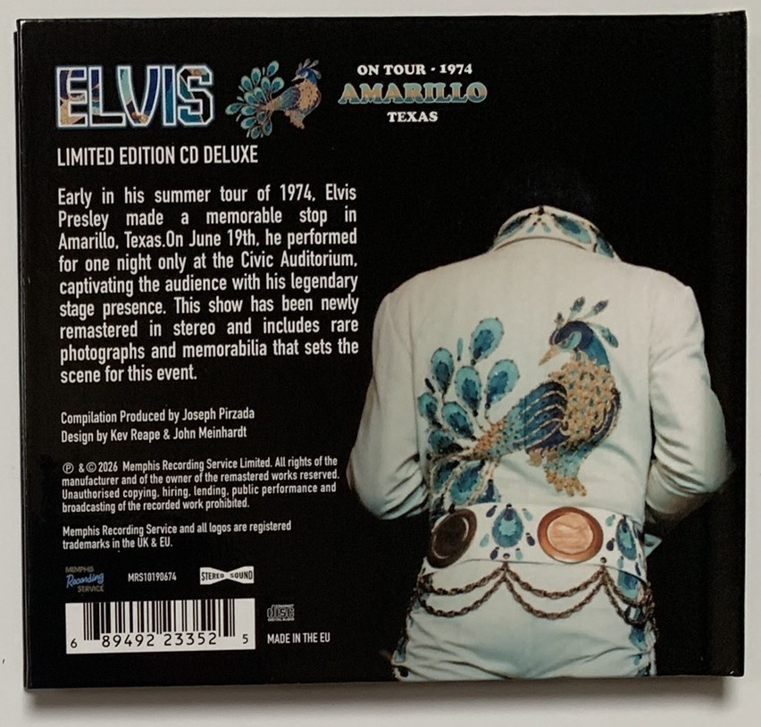 Aan het begin van zijn legendarische zomertournee van 1974 maakte Elvis Presley een onvergetelijke stop in Amarillo, Texas. Op 19 juni gaf hij een exclusief optreden in het Civic Auditorium, waar hij het publiek volledig in de ban hield met zijn ongeëvenaarde podiumpresentatie. Deze historische show is nu voor het eerst volledig geremasterd in schitterend stereo. Op de cover van deze release zien we een fantastische foto van Elvis in zijn Peacock Suit in een indrukwekkende karate move.